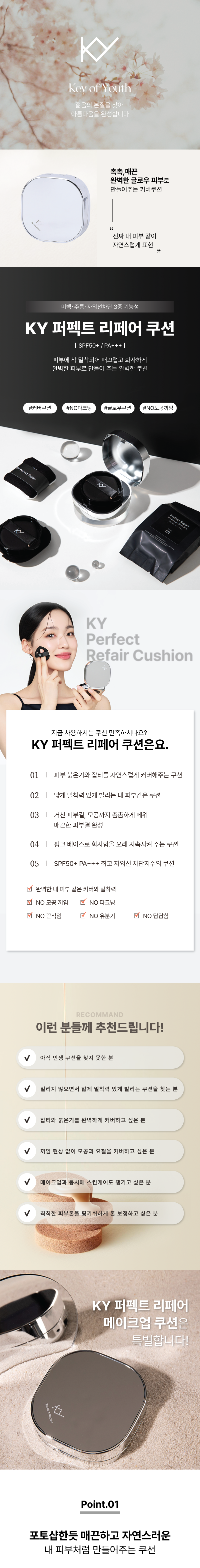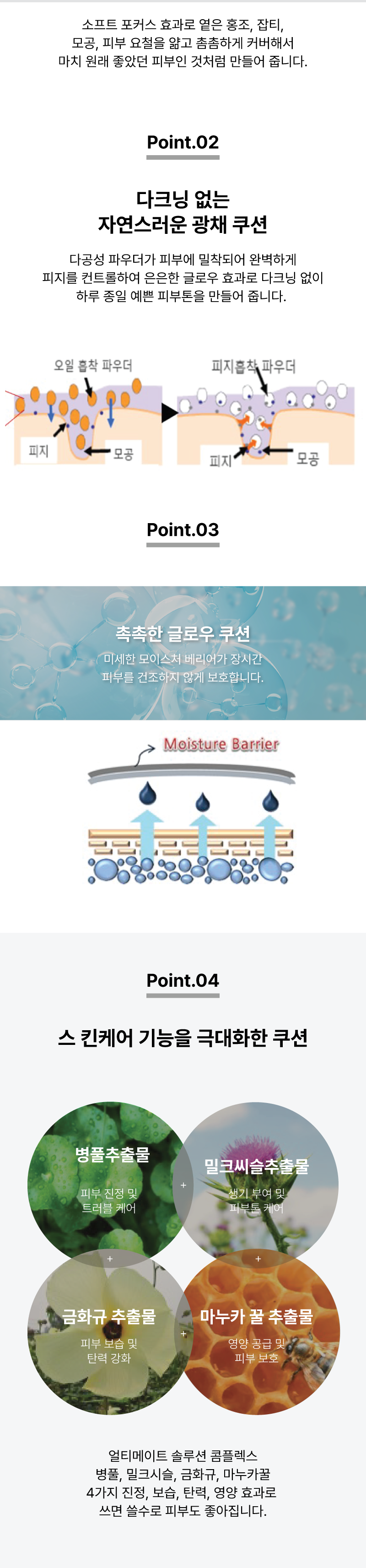 피부 흔적과 잡티를 자연스럽고 효과적으로 완벽 커버하여 매끄러운 피부 연출 다공성 파우더의 피지 컨트롤로 파우더 처리 필요 없는 보송한 마무리감 미세한 보습막을 형성하여 피부 내 수분을 잡아주고, 장시간 촉촉한 피부 유지